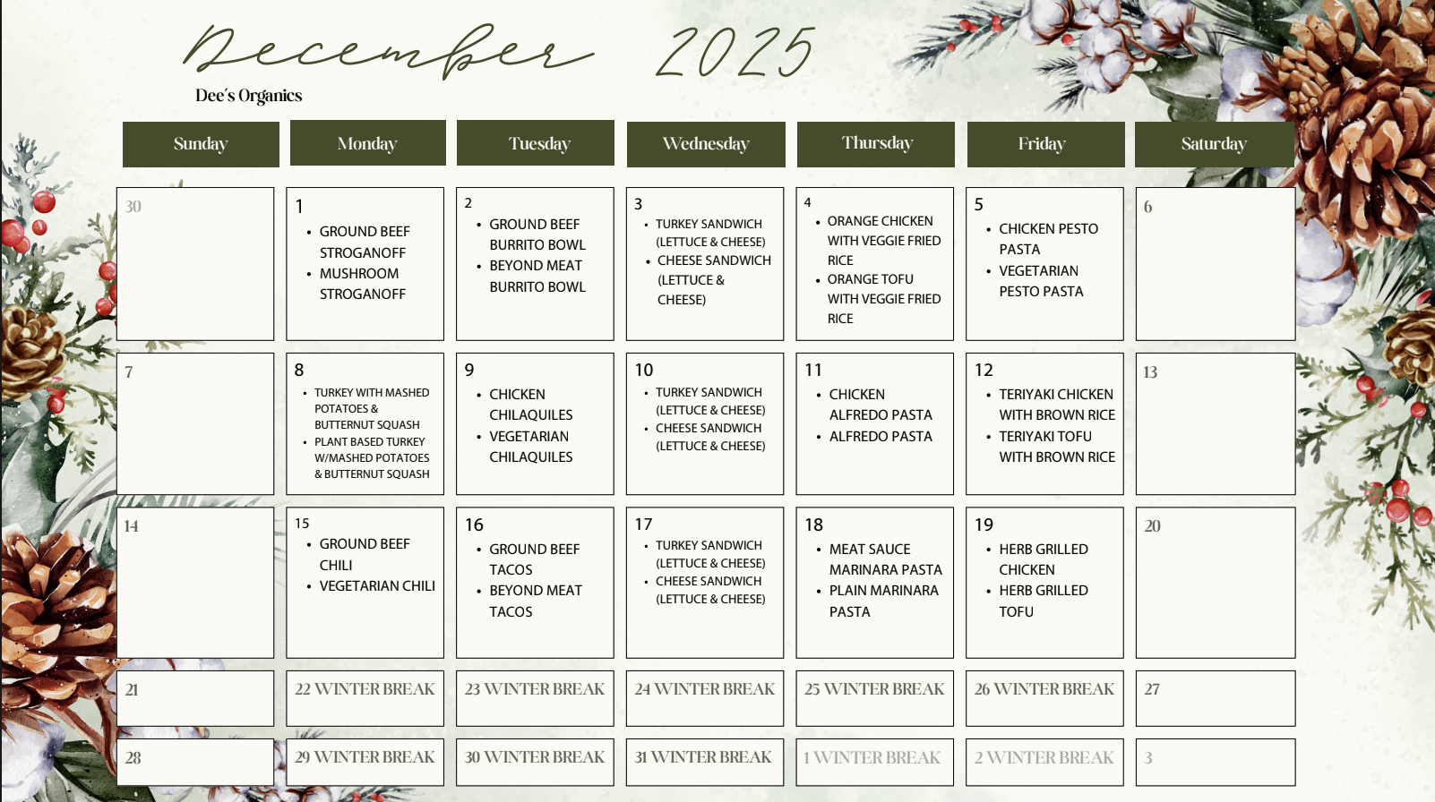 Unfortunately, I am writing to inform you about an upcoming change to our school food service operations. We recently received notification that our current food service vendor, Dee’s Organics, has made the difficult decision to step away from public school food service contracts, effective the end of December. We want to be clear that this vendor will continue to provide uninterrupted meal service through December. While we are disappointed by this shift, we want to recognize the partnership for this school year.