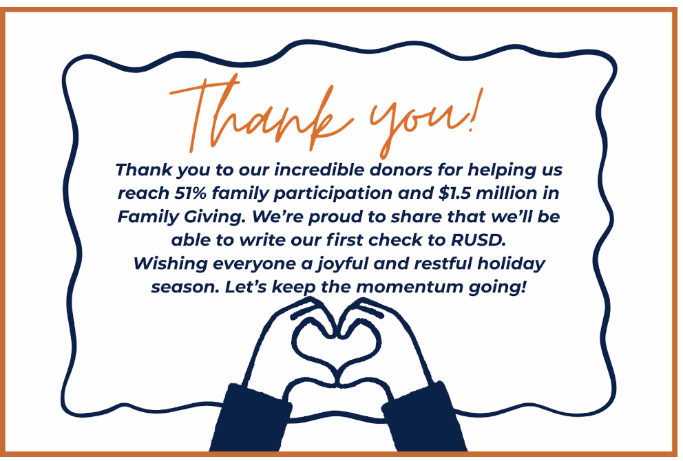 This year, our RUSD PTA members have shown up in countless ways: volunteering your precious time at school-wide events, organizing and serving lunches, generously donating to our Adopt-a-Family program to bring joy to families in need, going above and beyond for staff appreciation to let our incredible teachers and staff know