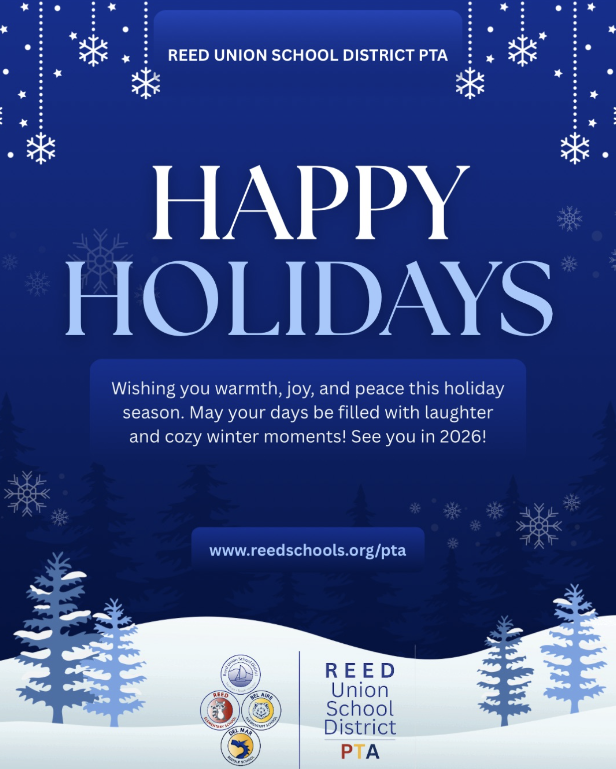 Remember that attendance matters! Please keep consistent attendance for kids! Happy Holidays, Dr. Kimberly McGrath Superintendent Reed Union School District "We are even stronger together!" |