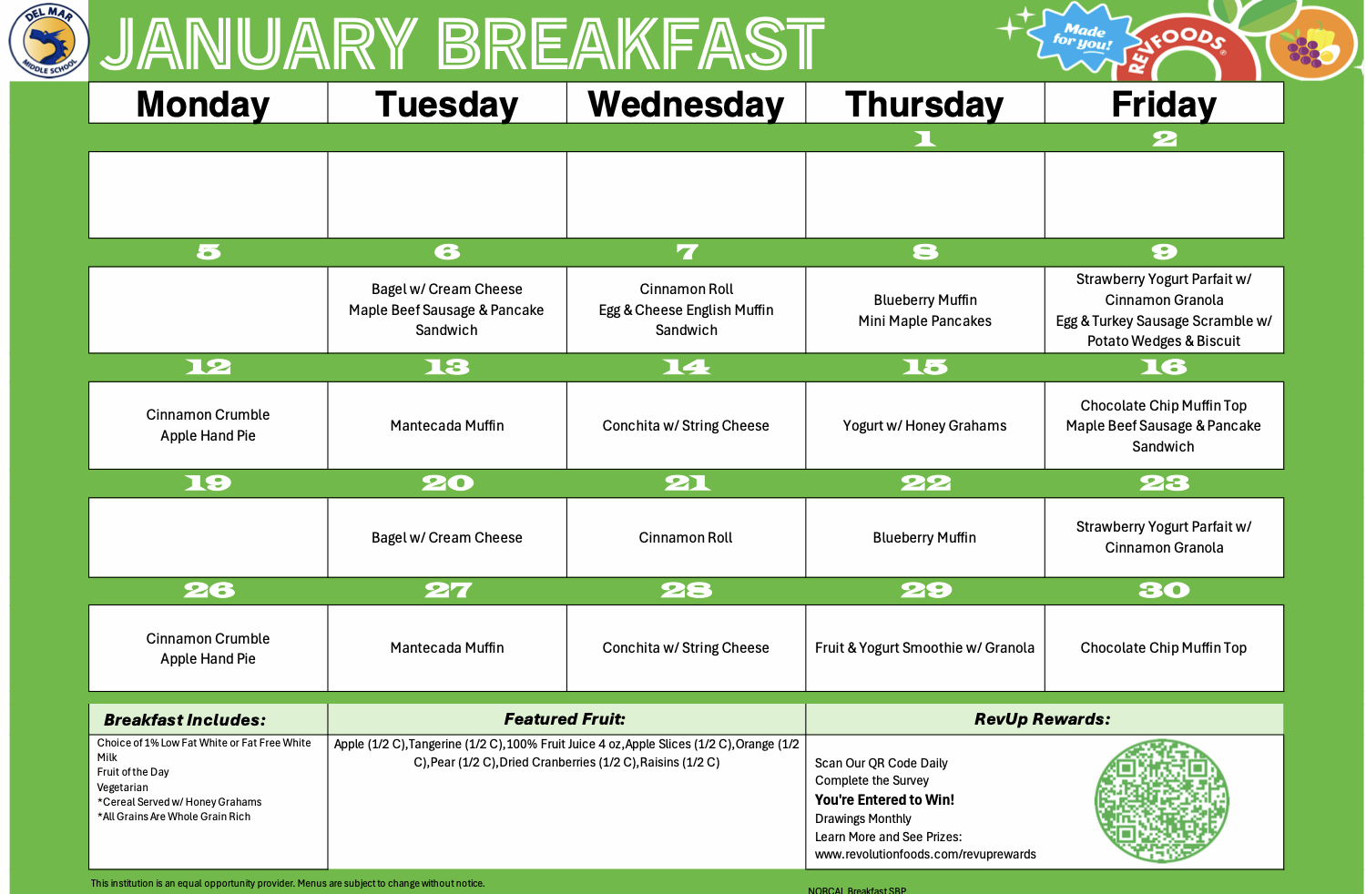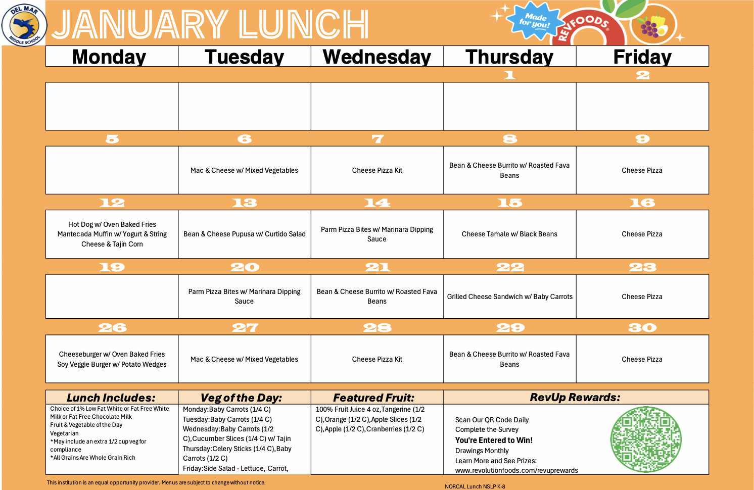 most morning breaks. The DelMarket is located next to room 20, near the library, and students can bring single dollars to pay for snacks and drinks at the first break. $5.00 snack packs are also available! Please remember to send water and snacks, and please remember: NO food delivery services are permitted on campus.. Attached HERE is allergen and nutrition information sent from Revolution Foods for all Revolution Food items. | A heartfelt thank you to all families who participated in Adopt A Family. We were able to help 10 families celebrate the holidays including holiday cards for each family member. Thank you Mr. Synder for coordinating it all! | RUSD PTA is seeking engaged PTA members to serve on the 2026 Nominating Committee for the PTA Executive Board. The committee will consist of five members and one alternate. Familiarity with all three school sites and their volunteer communities is preferred, but not required.