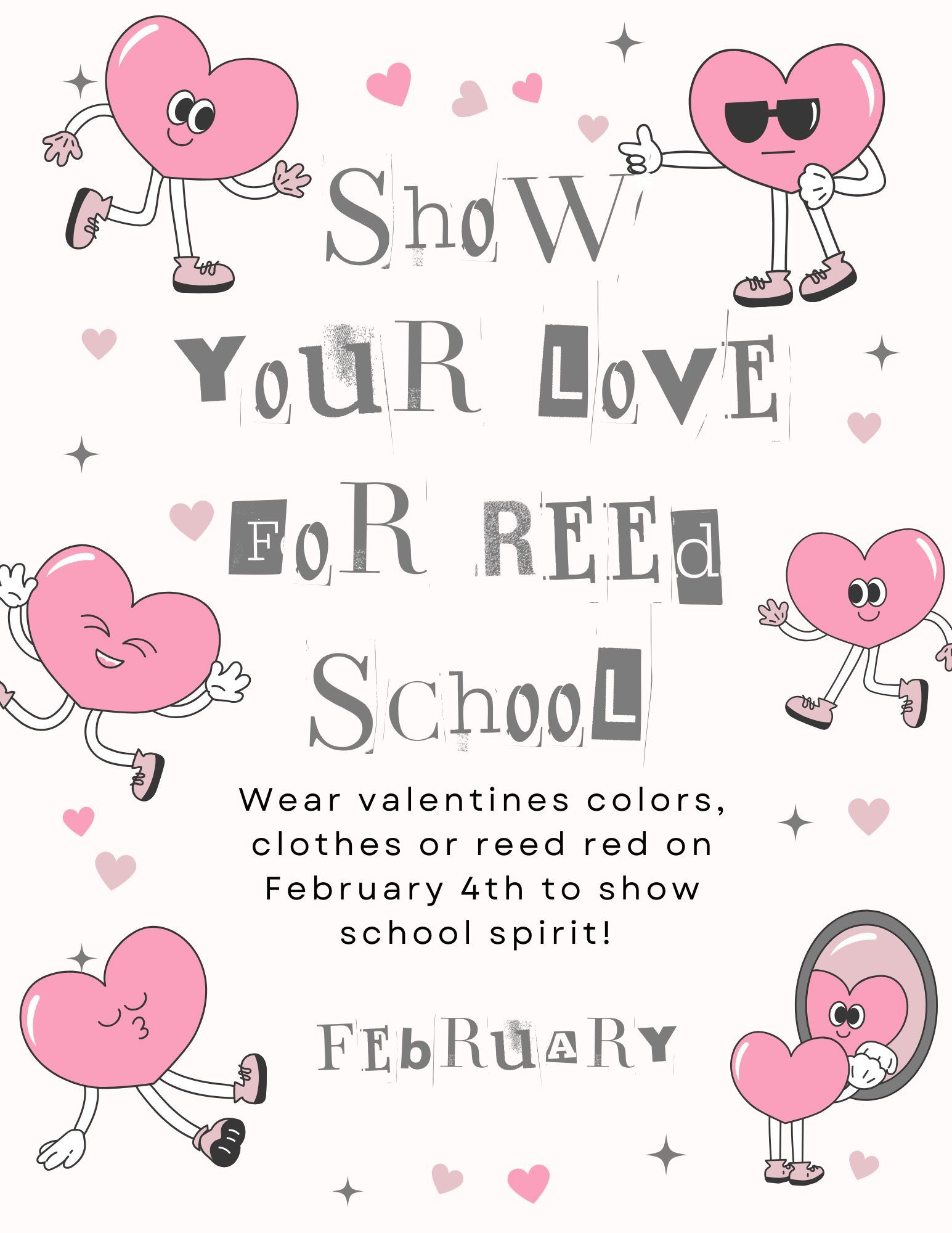 Reed Spirit Day: Show Your Love for Reed School! Wednesday, February 4 (flyer below) | Walk & Roll with Love Wednesday, February 4 | 1st Grade Music Performance Wednesday, February 11 at 8:30am | Reed PTA Meeting Wednesday, February 11 at 9:00am in Room 10 | Mid-Winter Break (NO SCHOOL) February 16-20 | 2nd Grade Music Performance Wednesday, March 11 at 8:30am |