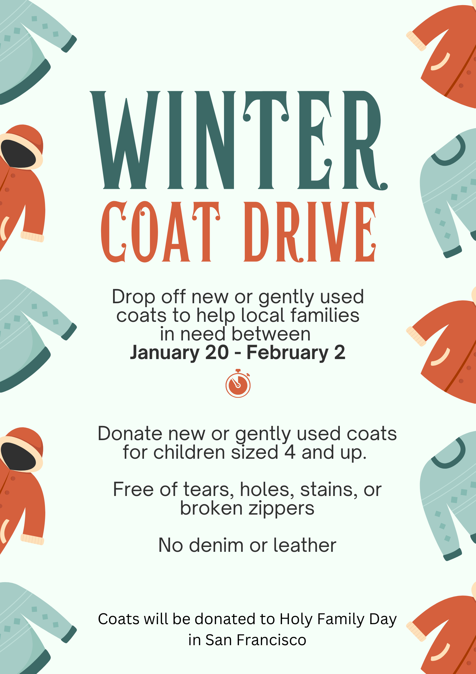 We’re holding a Coat Drive at Reed School to collect new or gently used coats for Holy Family Day. Holy Family Day Home provides family support services and affordable childhood education for struggling families in San Francisco.